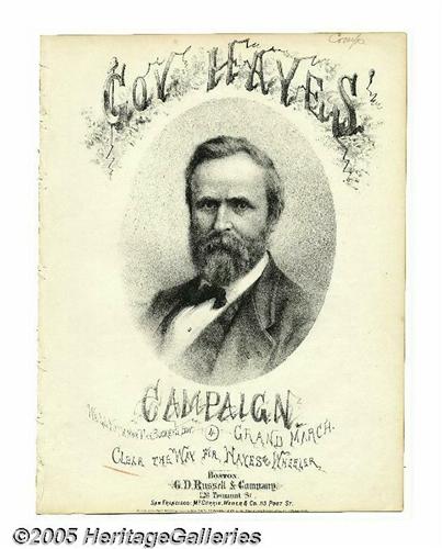 <B>1876 Rutherford B. Hayes and William Wheeler Sheet Music</B></I> Very unusual copy of <I>Clear the Way for Hayes and Wheeler,</B></I> part of the three-part series issued for "Gov. Hayes' Campaign." Bold portrait on the cover of the Civil War general and husband of Lemonade Lucy. Disbound from volume. Overall very clean and bright. A liberty cap on a pole appears at top and the letters are drawn like tree branches. 10 1/4" x 13 1/4", six pages (mislabeled as five). Quite nice. Lot:259