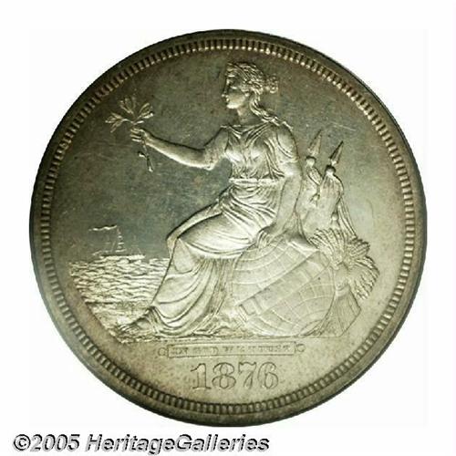 <B>1876<S$1> Dollar, Judd-1467, Pollock-1618, High R.7, PR63 PCGS.</B></I> The obverse shows Liberty seated on the seashore, holding an olive branch, with conjoined flags behind her. A steamship is in the distance. The reverse is rather plainly laid out with ONE DOLLAR in the center, surrounded by an olive wreath with UNITED STATES OF AMERICA around the upper margin and E PLURIBUS UNUM in small letters at the bottom of that side. Struck in silver with a reeded edge. 1876 pattern dollars are very rare and many advanced collectors lack an example. Only five examples are alleged to have been struck of this particular pattern, with only three pieces traced today. These pieces were struck on Trade dollar planchets, implying that these are legitimate Trade dollar patterns. The surfaces are lightly hairlined with no obvious or distracting blemishes on either side. Light, smoky gray-golden toning is seen on each side with much lighter, almost brilliant centers. Nice proof reflectivity in the fields.<BR><I>Ex: Julian Leidman; Rogers M. Fred, Jr. Collection; Fred-Ward Collections (Bowers and Merena, 11/95), lot 2305.</B></I>
