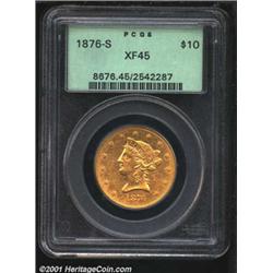 1876-S $10 XF45 PCGS.<p>Only 5,000 pieces were struck of the 1876-S Eagle, which gives it the second lowest mintage of all S-mint Tens, behind only the 1864-S and it is tied with the 1860-S. Needless to say, survivors are rare in all grades and high grade pieces are very elusive (apparently no Uncirculated coins have survived). Well defined, the surfaces are bright and relatively problem-free for the grade with no mentionable abrasions on either side. Important notice: We expect to be auctioning lots at the rate of 200-250 per hour. Sometimes eBay Premier live bid software cannot keep up with that pace, so we strongly recommend that you place a realistic proxy bid now as insurance to avoid disappointment. Also please note that all Heritage/CAA lots purchased through eBay Premier carry a 20% Buyer's Premium.