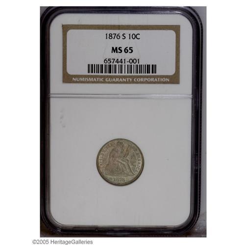 1876-S 10C MS65 NGC. Type One Reverse. Gem, with patch 1876-S[10C] MS65 NGC.