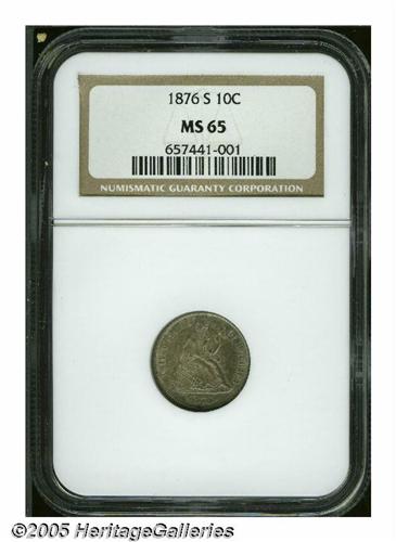 <B>1876-S<10C> MS65 NGC.</B></I> Type One Reverse. Gem, with patches of variegated crimson, green and orange color. Vaguely matte luster, some faint abrasions are noted in the right obverse field. Population: 12 in 65, 3 finer (6/05).