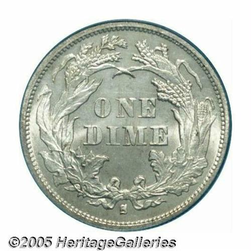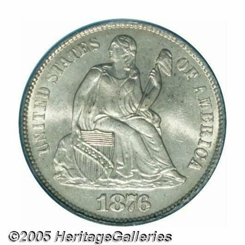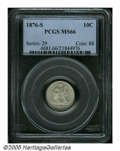 <B>1876-S<10C> MS66 PCGS.</B></I> Type One Reverse. Lightly toned in honey-gray hues, this highly lustrous premium Gem is nearly immaculate and has an imposing strike. Not a rare issue, but an outstanding type coin nonetheless. The reverse is lightly die doubled, most apparent on the upper right serif of the N in ONE. Population: 5 in 66, 0 finer (4/05).