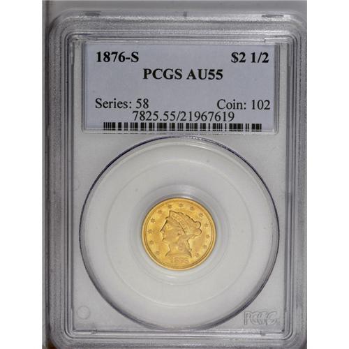 <B>1876-S<$2 1/2> AU55 PCGS.</B></I> Nicely struck for this issue with a trace of wear on the honey-gold devices. The amber-orange fields retain much of their original luster.