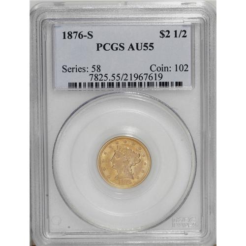 1876-S $2 1/2 AU55 PCGS. Nicely struck for this issue