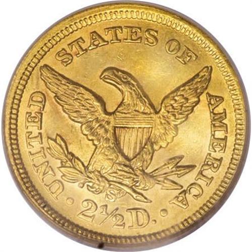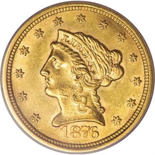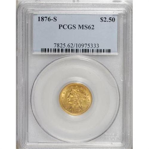 <B>1876-S $2 1/2 MS62 PCGS.</B></I> This is a remarkably bright, flashy example of the second-lowest quarter eagle mintage from the San Francisco Mint. Highly lustrous with rich apricot-gold coloration that displays hints of mint-green, the piece has an amazingly small number of wispy marks, for the grade. The small mint-made die defect on Liberty's jaw is seen on all known specimens (Jeff Garrett and Ron Guth, 2006). Nearly unsurpassable quality, as none have been graded finer than MS63 by either of the major grading services. Population: 6 in 62, 4 finer (6/07).<BR><BR><B>Coin Engraver:</B> Christian Gobrecht<BR><BR><b>Shipping:</b> Coins & Currency (<a target="_blank" href="http://www.heritageauctions.com/common/shipping.php">view shipping information</a>\)