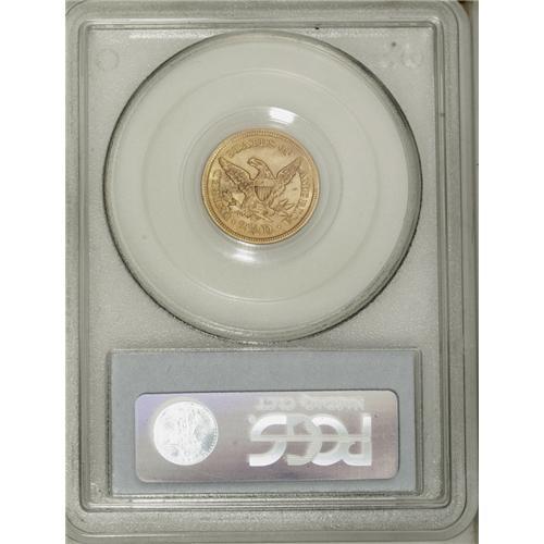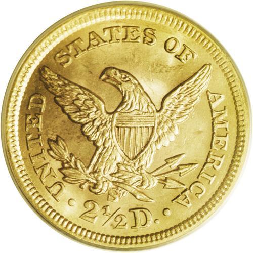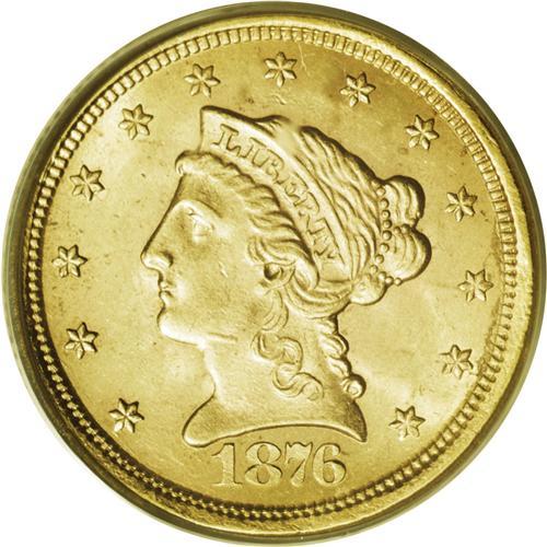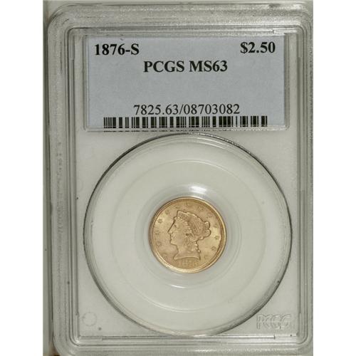 <B>1876-S<$2 1/2> MS63 PCGS.</B></I> Ex: Bass. Peach-gold color covers this coin, with a bit of rose highlighting the recessed areas of the devices. Ample frosty luster is seen most prominently on the reverse. A bit weakly struck in the centers, normal for the date, yet well-struck for the date and more sharply struck than at least two of the other coins that have been bestowed similar grades by PCGS. The die line (as struck), which is visible on Liberty's jaw, appears on all 1876 quarter eagles from both mints. At 5,000 coins struck, the 1876-S is the second lowest mintage quarter eagle from the San Francisco mint, and uncirculated pieces are scarce. Those reaching the MS63 grade, such as this piece, are scarcer still, and indeed the major grading services have not yet graded an example of the date finer. Population: 4 in 63, 0 finer (8/06).<BR><I>From The Della Collection.</B></I>