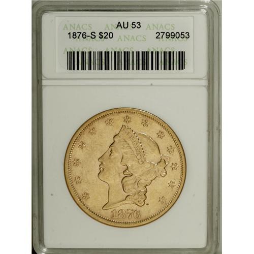 <B>1876-S $20 AU53 ANACS.</B></I> NGC Census: (183/3795). PCGS Population (158/1978). Mintage: 1,597,000. Numismedia Wsl. Price: $695. (#8978)<BR><BR><b>Shipping:</b> Coins & Currency (<a target="_blank" href="http://www.heritageauctions.com/common/shipping.php">view shipping information</a>)