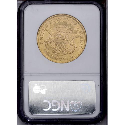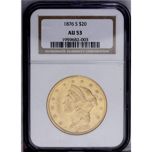 <B>1876-S<$20> AU53 NGC.</B></I> Traces of luster are apparent in the protected areas of this honey-gold example. Portions of Liberty's hair reveal weakness, and Liberty's cheek, neck, and the reverse shield show some moderate abrasions.
