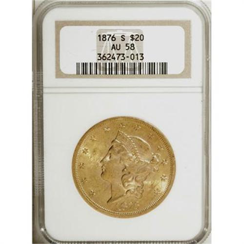 <B>1876-S $20 AU58 NGC.</B></I> NGC Census: (1903/1477). PCGS Population (562/1158). Mintage: 1,597,000. Numismedia Wsl. Price for NGC/PCGS coin in AU58: $758. (#8978)<BR><BR><B>Coin Engraver:</B> James B. Longacre<BR><BR><b>Shipping:</b> Coins & Currency (<a target="_blank" href="http://www.heritageauctions.com/common/shipping.php">view shipping information</a>)