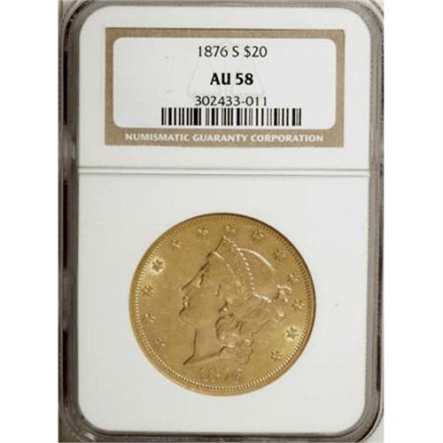 <B>1876-S $20 AU58 NGC.</B></I> NGC Census: (1908/1482). PCGS Population (564/1164). Mintage: 1,597,000. Numismedia Wsl. Price for NGC/PCGS coin in AU58: $820. (#8978)<BR><BR><B>Coin Engraver:</B> James B. Longacre<BR><BR><b>Shipping:</b> Coins & Currency (<a target="_blank" href="http://www.heritageauctions.com/common/shipping.php">view shipping information</a>)