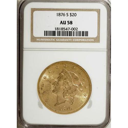 <B>1876-S $20 AU58 NGC.</B></I> NGC Census: (1908/1482). PCGS Population (564/1164). Mintage: 1,597,000. Numismedia Wsl. Price for NGC/PCGS coin in AU58: $820. (#8978)<BR><BR><B>Coin Engraver:</B> James B. Longacre<BR><BR><b>Shipping:</b> Coins & Currency (<a target="_blank" href="http://www.heritageauctions.com/common/shipping.php">view shipping information</a>)