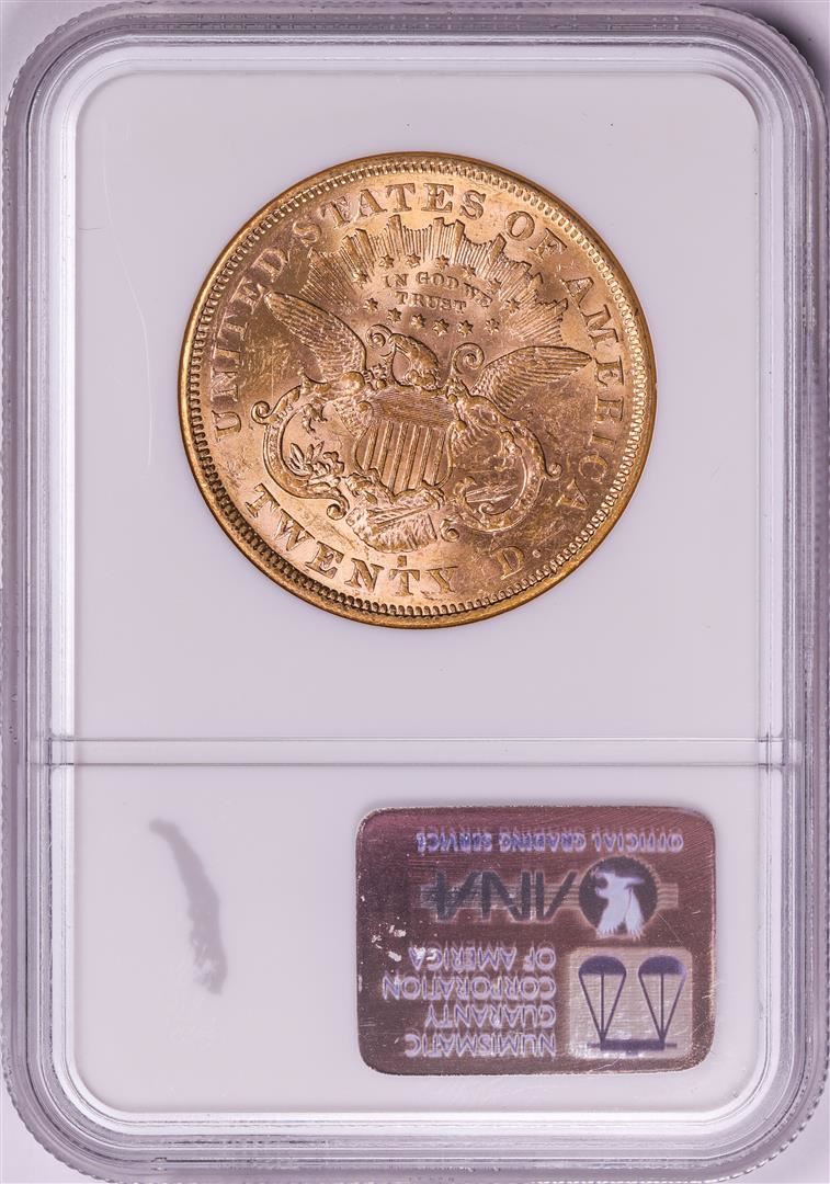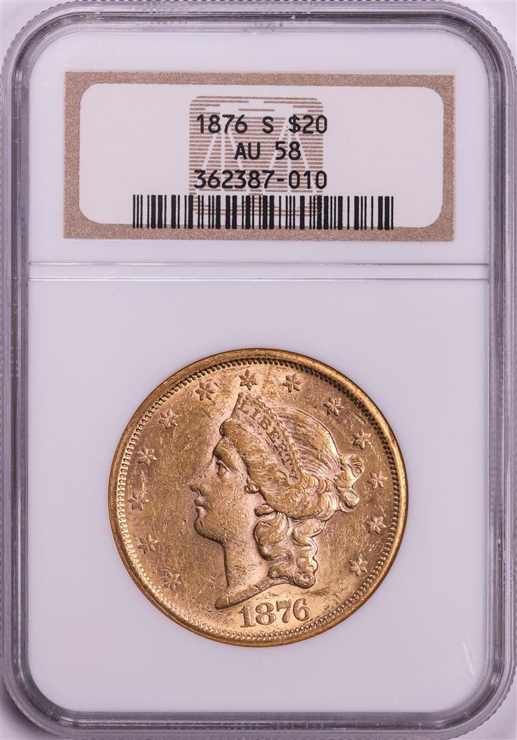 One 1876-S $20 Liberty Head Double Eagle Gold Coin NGC AU58. NGC Certified.