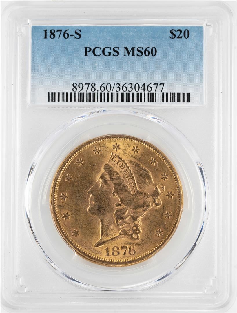 One 1876-S $20 Liberty Head Double Eagle Gold Coin PCGS MS60. PCGS Graded.