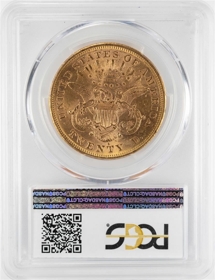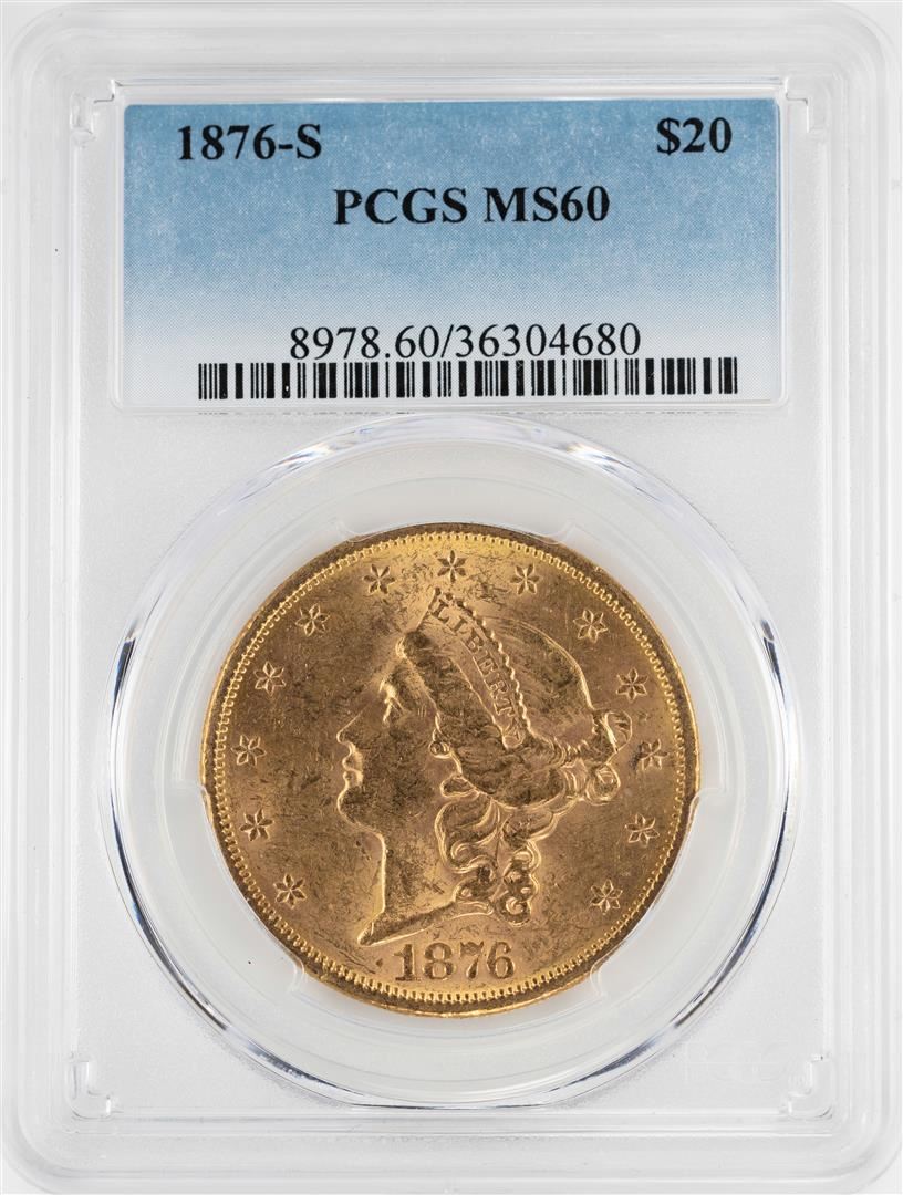 One 1876-S $20 Liberty Head Double Eagle Gold Coin PCGS MS60. PCGS Graded.