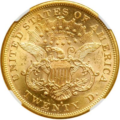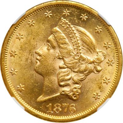 1876-S $20 Liberty. NGC graded AU-58 PQ. A nice frosty coin. Comes with a PCGS AU-58 tag (PCGS # 8978) .