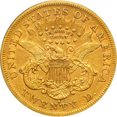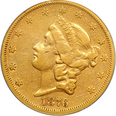 1876-S $20 Liberty. PCGS graded EF-40. Rich golden shades. A small mark on the cheek (PCGS # 8978) .
