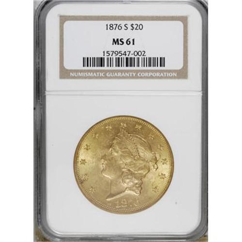 <B>1876-S $20 MS61 NGC.</B></I> . NGC Census: (748/386). PCGS Population (425/491). Mintage: 1,597,000. Numismedia Wsl. Price for NGC/PCGS coin in MS61: $1,350. (#8978)<BR><BR><B>Coin Engraver:</B> James B. Longacre<BR><BR><b>Shipping:</b> Coins & Currency (<a target="_blank" href="http://www.heritageauctions.com/common/shipping.php">view shipping information</a>)