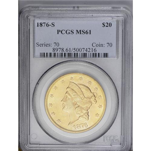 <B>1876-S<$20> MS61 PCGS.</B></I> A frosty and lustrous Mint State example with lovely light yellow color. A few faint hairlines keep this example from a higher grade.