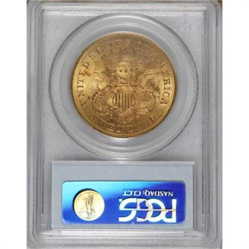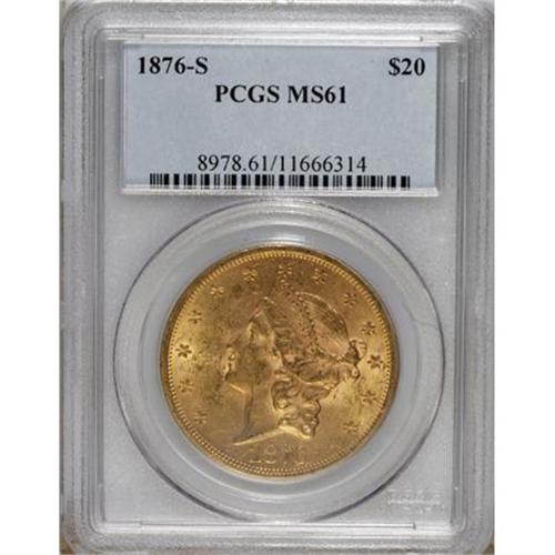 <B>1876-S $20 MS61 PCGS.</B></I> This lustrous example has blended pale lime and butter-gold toning. A well struck and moderately abraded representative of this popular Centennial-year issue.<BR><BR><b>Shipping:</b> Coins & Currency (<a target="_blank" href="http://www.heritageauctions.com/common/shipping.php">view shipping information</a>)