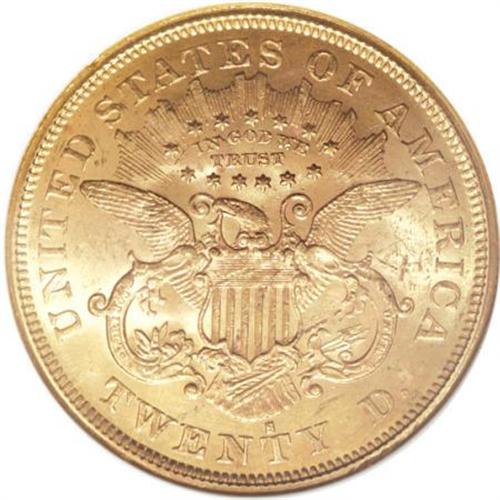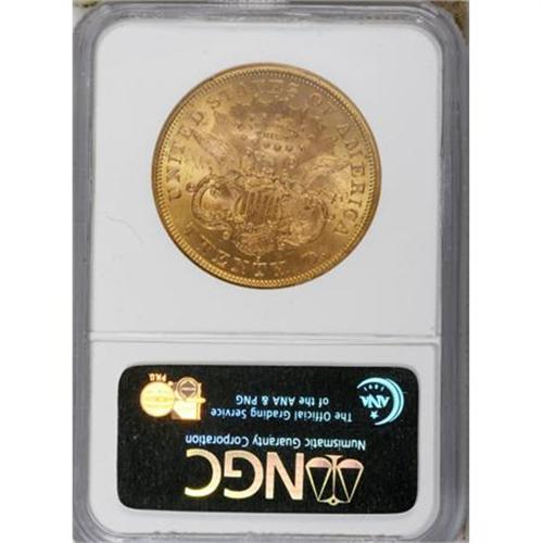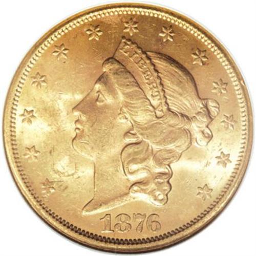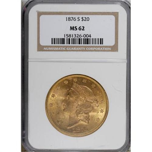 <B>1876-S $20 MS62 NGC.</B></I> This crisply struck and thoroughly lustrous Centennial-year twenty has scattered minor field marks, as expected of the grade, but the portrait is relatively clean. A popular issue since it represents the scarcer Type Two design, which has IN GOD WE TRUST but abbreviates the denomination as TWENTY D.<BR><BR><b>Shipping:</b> Coins & Currency (<a target="_blank" href="http://www.heritageauctions.com/common/shipping.php">view shipping information</a>)