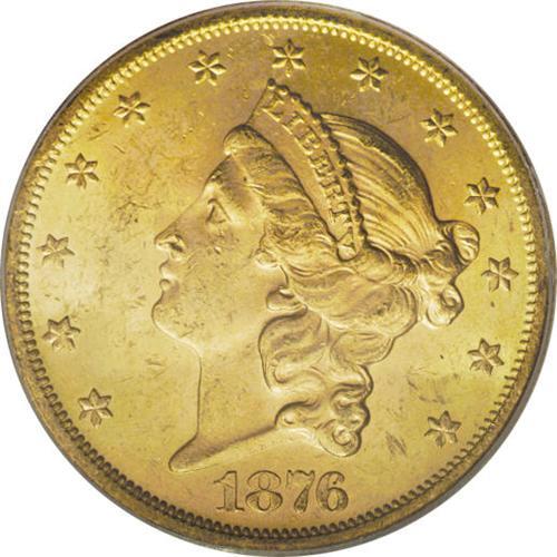 <B>1876-S $20 MS62 PCGS.</B></I> A trebly popular issue, as a representative of the U.S. Centennial year, as the last of the Type Two double eagles, and for type sets as one of the most plentiful mintages in the Type Two series. Despite the large emission of nearly 1.6 million pieces, high-end pieces such as this delightful and lustrous MS62 piece are always in demand. The surfaces boast pretty apricot-gold coloration, a strong strike, good eye appeal, and a few light abrasions that parallel the grade. Some nice strike doubling is noted on TWENTY, as a bonus.<BR><BR><b>Shipping:</b> Coins & Currency (<a target="_blank" href="http://www.heritageauctions.com/common/shipping.php">view shipping information</a>)