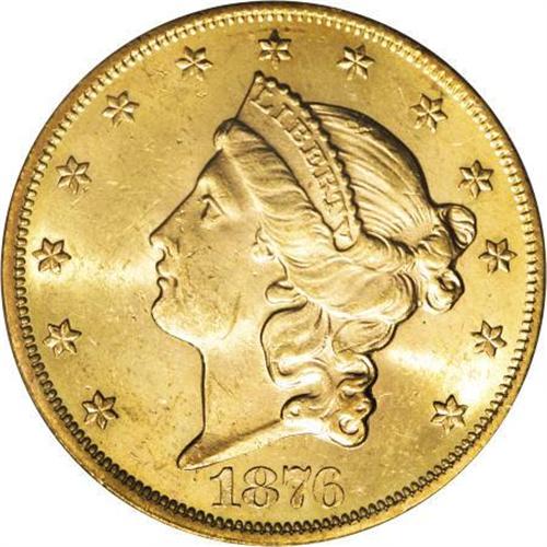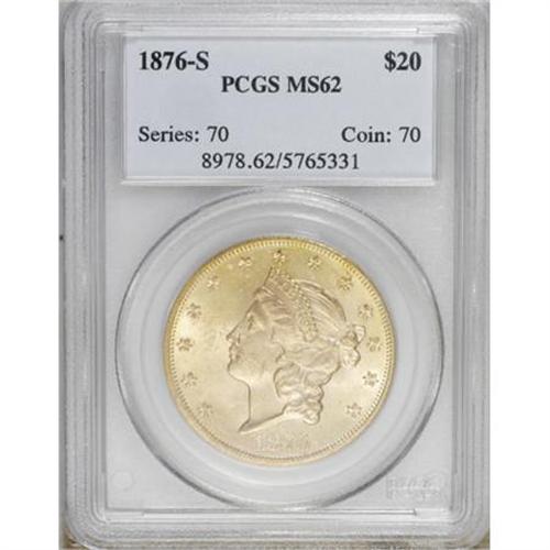 <B>1876-S $20 MS62 PCGS.</B></I> A well-struck representative with bold, active luster and a pleasant honey-gold color. With a large mintage for a Type Two double eagle, this issue is relatively obtainable in grades through MS61, but becomes scarcer at or above MS62. A few too many marks, including a cut on Liberty's nose limits the grade, but not the sparkle. <BR><BR><B>Coin Engraver:</B> James B. Longacre<BR><BR><b>Shipping:</b> Coins & Currency (<a target="_blank" href="http://www.heritageauctions.com/common/shipping.php">view shipping information</a>)