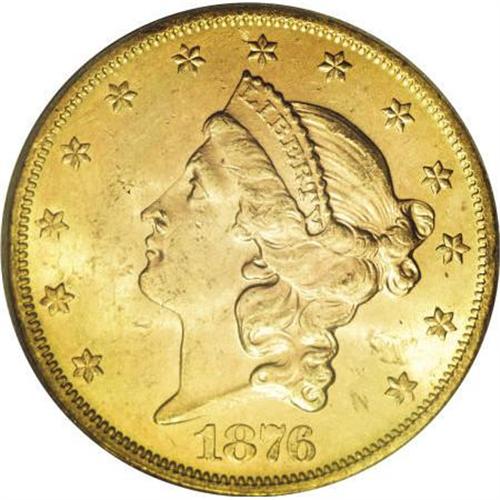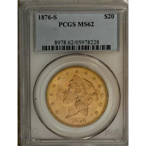 <B>1876-S $20 MS62 PCGS.</B></I> A popular issue on several different counts: as a representative of the U.S. Centennial year; as the last of the Type Two double eagles; and for type sets as one of the most plentiful mintages in the Type Two series. Despite the large emission of nearly 1.6 million pieces, high-end pieces such as this delightful and lustrous MS62 piece are always in demand. The surfaces boast pretty apricot-gold coloration, a strong strike, good eye appeal, and a few light abrasions that parallel the grade. Some nice strike doubling is noted on TWENTY, as a bonus. <BR><BR><B>Coin Engraver:</B> James B. Longacre<BR><BR><b>Shipping:</b> Coins & Currency (<a target="_blank" href="http://www.heritageauctions.com/common/shipping.php">view shipping information</a>)