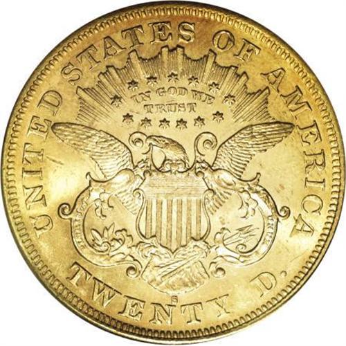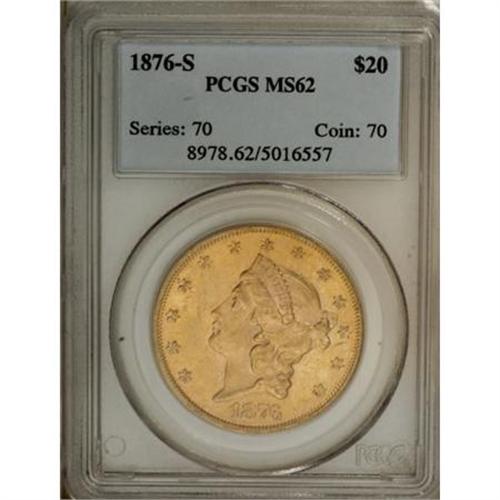<B>1876-S $20 MS62 PCGS.</B></I> The surfaces are fairly prooflike on this delightful Centennial Type Two double eagle, which radiates bold luster and premium eye appeal. The bold cartwheel luster completes the attractive package, despite the few light scrapes that preclude a finer grade.<BR><I>From The Wild West #1 NGC Registry of Type Three Double Eagles.</B></I><BR><BR><B>Coin Engraver:</B> James B. Longacre<BR><BR><b>Shipping:</b> Coins & Currency (<a target="_blank" href="http://www.heritageauctions.com/common/shipping.php">view shipping information</a>)