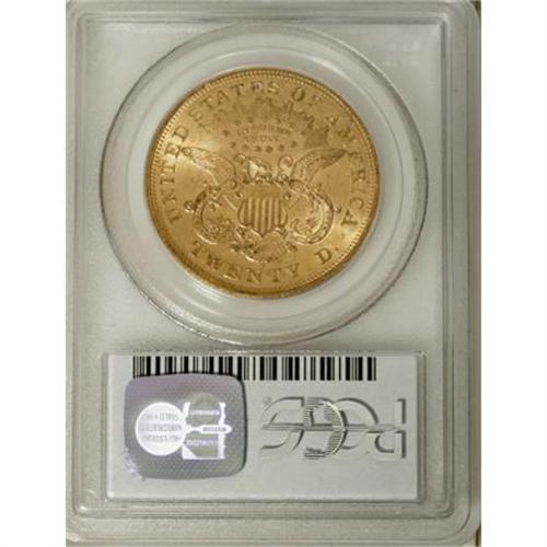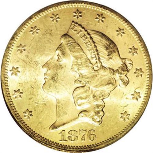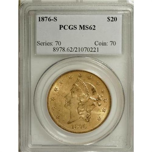 <B>1876-S $20 MS62 PCGS.</B></I> The San Francisco Mint's double eagle contribution to Centennial coinage amounted to a generous emission approaching 1.6 million coins, and today examples are available for a price up to the Gem level. This MS62 piece offers radiant cartwheel luster over orange-gold surfaces with charcoal-gray high points.<BR><BR><B>Coin Engraver:</B> James B. Longacre<BR><BR><b>Shipping:</b> Coins & Currency (<a target="_blank" href="http://www.heritageauctions.com/common/shipping.php">view shipping information</a>)