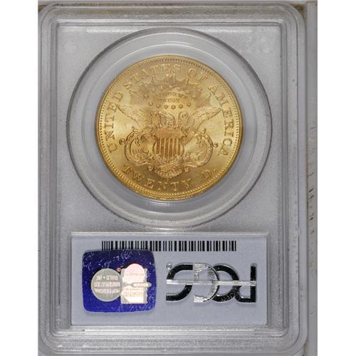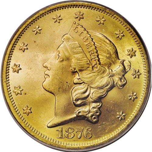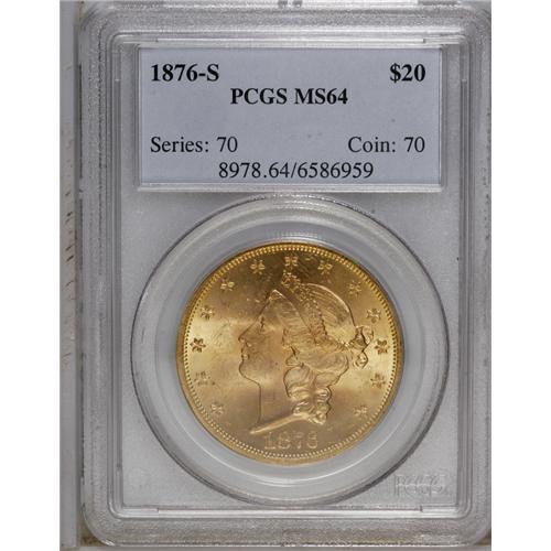 <B>1876-S $20 MS64 PCGS.</B></I> The PCGS population is just 50, with only four finer pieces--for the entire design type! Although a large number of examples have been returned to the United States after a century or more in European and other overseas bank vaults, nearly all examples have proved to be low in the Mint State grade range. Circulated examples of this issue are plentiful in all grades, and Mint State pieces are easy to acquire in MS60 through MS62 grades. Even MS63 grade coins are not difficult to locate with a little patience, but MS64 examples are extremely difficult to find, and Gem specimens are impossible. In fact, PCGS has only certified one such example of this date.<BR> The Type Two design has proven to me a major condition rarity in the double eagle series. While Type Three examples are common in all grades, and Type One coins have become common in recent years due to the recovery of treasure from the <I>S.S. Central America, S.S. Republic,</B></I> and <I>S.S. Brother Jonathan,</B></I> there have not been any treasury recoveries of this design type.<BR> Its combination of elusiveness and aesthetic appeal makes this a coin for the numismatic dreamer. The impression is sharp, or perhaps full, and the surfaces have frosty yellow luster with light rose overtones. Each side has a limited quota of surface marks. The advanced double eagle specialist may wish to carefully examine the dentils below the 76 for some stray die markers that could represent a blundered date. Population: 9 in 64, 1 finer (4/07).<BR><BR><b>Shipping:</b> Coins & Currency (<a target="_blank" href="http://www.heritageauctions.com/common/shipping.php">view shipping information</a>)