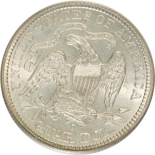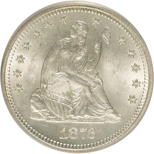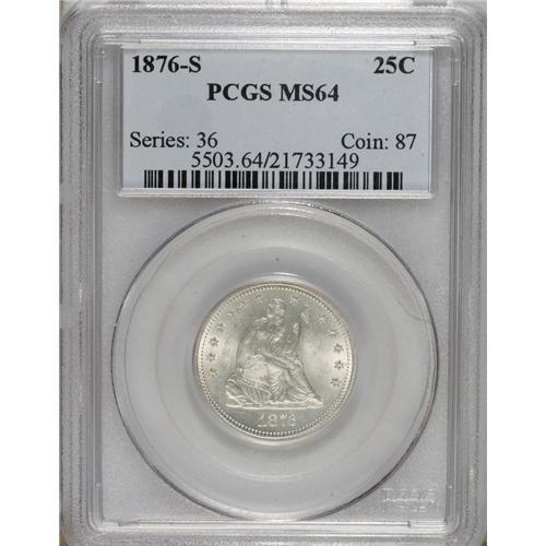 <B>1876-S 25C MS64 PCGS.</B></I> PCGS Population (52/20). NGC Census: (62/26). Mintage: 8,596,000. Numismedia Wsl. Price: $655. (#5503)<BR><BR><b>Shipping:</b> Coins & Currency (<a target="_blank" href="http://www.heritageauctions.com/common/shipping.php">view shipping information</a>)