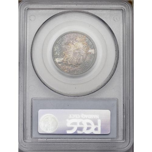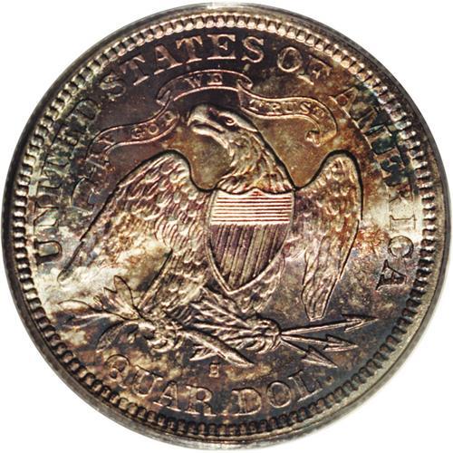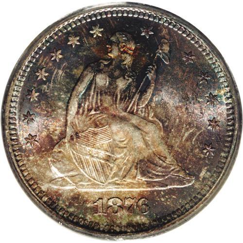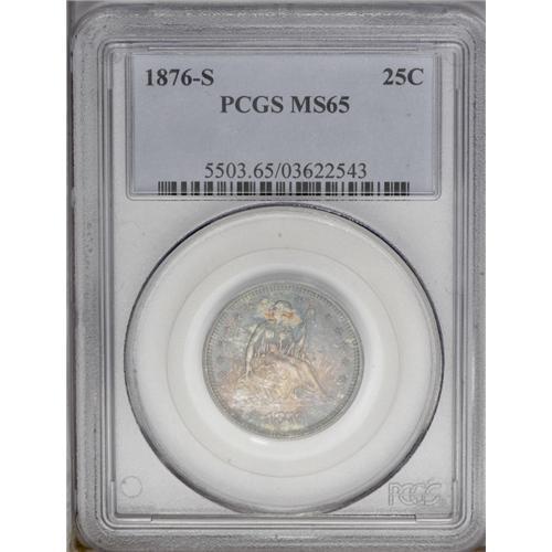 <B>1876-S<25C> MS65 PCGS.</B></I> Type Two Reverse. All letters in STATES are widely separated. A gorgeous Gem with satiny luster beneath an intermingled display of rainbow color on both sides. A few minor abrasions scattered about the surface and within the design elements on both sides keep this away from a higher grade, and yet it is approaching the finest certified for the date. Given its status as a common date, from a mintage well in excess of 8 million coins, surprisingly few have been certified in the Gem grades. Population: 16 in 65, 1 finer (4/06).