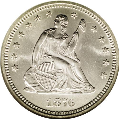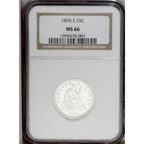 <B>1876-S<25C> MS66 NGC.</B></I> Type Two Reverse. A thoroughly lustrous and penetratingly struck Premium Gem that features exceptionally clean surfaces. This essentially brilliant Centennial year example is worthy of the finest quality silver type set. NGC and PCGS combined have certified nine pieces in the MS66 grade with none finer, as of (2/06).