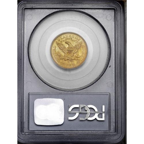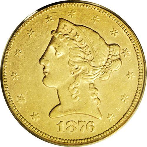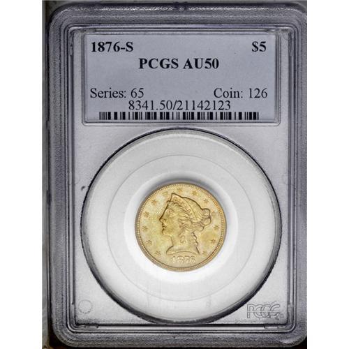 <B>1876-S<$5> AU50 PCGS.</B></I> Despite the anomaly of multiple appearances in this year's Central States sale, the 1876-S half eagle is one of the scarcest of all San Francisco issues within this long-lived type, both outright and from a condition standpoint. This example is very well struck and is tinged in milky orange patina. Close examination reveals a hint of prooflike luster in the recesses.<BR><I>From The Steve Glenn Collection.</B></I> <BR><BR><B>Important notice:</B> Heritage usually auctions material at the rate of 200-250 lots per hour. On some occasions eBay Live bid software or the Internet may not be able to keep up with the pace of the auction. We recommend placing a realistic absentee bid now as insurance to avoid disappointment. Occasionally the auctioneer may eliminate or reject an eBay Live bid, and the auctioneer may also reopen a lot after the close of the eBay live bidding (usually because we missed an audience bid), and may reject your bid even if it shows you as the winning bidder. By bidding via eBay Live, you agree that Heritage may award the lot to another bidder at its sole discretion under the circumstances described above or any other reasonable circumstances. Since eBay bids are not shown to us until we open the lot on the floor, we treat those bids just like floor bids. In most cases the floor responds before the eBay bid is presented to us, due to Internet lag time, so for consistency we have made it a policy that floor bids are always considered first over tie eBay live bids. Also please note that all Heritage lots purchased through eBay Live carry a 20% Buyer's Premium. Please make sure you read the Terms and Conditions before you bid. This lot is being auctioned in conjunction with a live floor auction by Heritage Galleries & Auctioneers. All final auction and invoice information will be supplied by Heritage Galleries & Auctioneers, and all other information should be considered preliminary. Lot:2793 <BR><BR><B>Winning Notification and Billing:</B> After the FINAL session in this auction is complete, Heritage will send e-mail and snail mail invoices. This process normally takes several days. All final auction and invoice information will be supplied by Heritage Galleries & Auctioneers, and all other information should be considered preliminary. <BR><BR>This auction will be conducted on a live auction floor and over the Internet through eBay Live. If you choose to place an absentee bid, please take a moment to <font color='#0000ff'><u><a href='http://pages.ebay.com/liveauctions/help/before/laabsentee.html'>learn how eBay Live absentee bidding works</a></u></font><font color='#000000'>