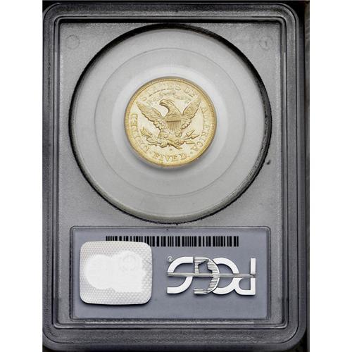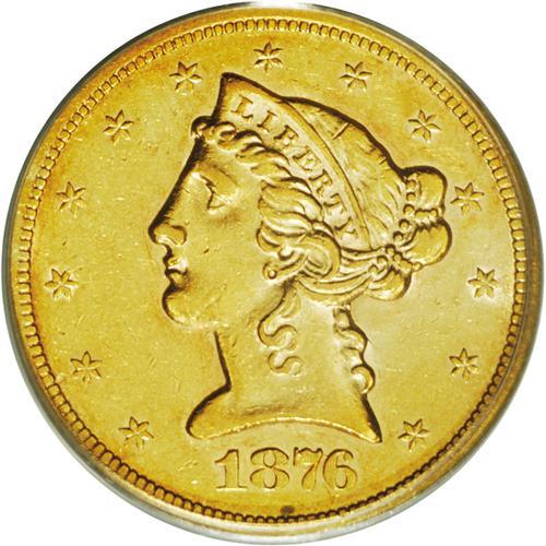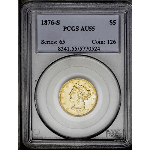 <B>1876-S<$5> AU55 PCGS.</B></I> Rich coppery-gold over luster and attractive for this elusive issue. The surfaces show fewer circulation marks than usually encountered and they are widely scattered over the surfaces. Liberty's face and neck are both relatively clean with no deep or distracting cuts that are so commonly found. Rather sharply impressed for this date, and a coin which is virtually impossible to find this nice. The San Francisco Mint coined a mere 4,000 pieces for the entire issue, and from that paltry sum just a handful apparently survived. It is probable that the present coin is within the top 10 known for this date, and most of those are comparable in grade. Centennial year issue, and a prize for the specialist. Population: 1 in 55, 1 finer (3/06). <BR><BR><B>Important notice:</B> Heritage usually auctions material at the rate of 200-250 lots per hour. On some occasions eBay Live bid software or the Internet may not be able to keep up with the pace of the auction. We recommend placing a realistic absentee bid now as insurance to avoid disappointment. Occasionally the auctioneer may eliminate or reject an eBay Live bid, and the auctioneer may also reopen a lot after the close of the eBay live bidding (usually because we missed an audience bid), and may reject your bid even if it shows you as the winning bidder. By bidding via eBay Live, you agree that Heritage may award the lot to another bidder at its sole discretion under the circumstances described above or any other reasonable circumstances. Since eBay bids are not shown to us until we open the lot on the floor, we treat those bids just like floor bids. In most cases the floor responds before the eBay bid is presented to us, due to Internet lag time, so for consistency we have made it a policy that floor bids are always considered first over tie eBay live bids. Also please note that all Heritage lots purchased through eBay Live carry a 20% Buyer's Premium. Please make sure you read the Terms and Conditions before you bid. This lot is being auctioned in conjunction with a live floor auction by Heritage Galleries & Auctioneers. All final auction and invoice information will be supplied by Heritage Galleries & Auctioneers, and all other information should be considered preliminary. Lot:2794 <BR><BR><B>Winning Notification and Billing:</B> After the FINAL session in this auction is complete, Heritage will send e-mail and snail mail invoices. This process normally takes several days. All final auction and invoice information will be supplied by Heritage Galleries & Auctioneers, and all other information should be considered preliminary. <BR><BR>This auction will be conducted on a live auction floor and over the Internet through eBay Live. If you choose to place an absentee bid, please take a moment to <font color='#0000ff'><u><a href='http://pages.ebay.com/liveauctions/help/before/laabsentee.html'>learn how eBay Live absentee bidding works</a></u></font><font color='#000000'>