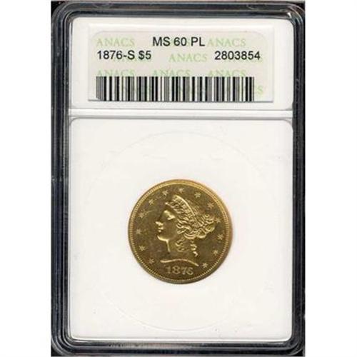 <b>1876-S $5 Liberty. ANACS graded MS60 PL.</b> A frosty golden specimen with strong luster present. A very "high end" 1876-S half eagle that some would designate even a point choicer on the Mint State scale. Inspect it in person and make your own decision. Either way, it is a top Condition Census coin of elegant quality. The 1876-S is elusive in all grades, and when found is typically Very Fine or even lower. Even an Extremely Fine piece would be a delicacy. Regarding the present Mint State coin, as noted there are few pieces in this category. Here is another major opportunity for the specialist.