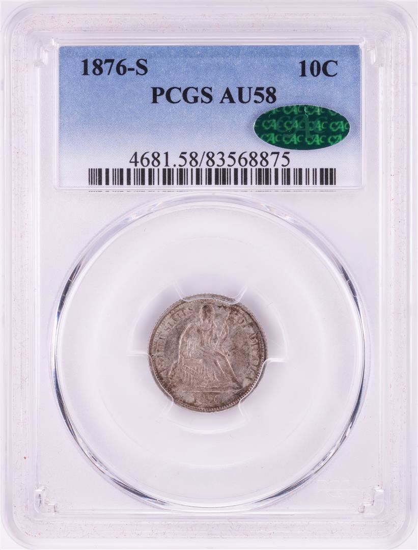 One 1876-S Seated Liberty Dime Coin PCGS AU58 CAC. PCGS Graded.