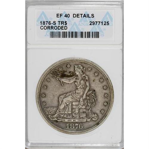 <B>1876-S T$1 --Corroded--ANACS. XF40 Details.</B></I> NGC Census: (3/510). PCGS Population (12/581). Mintage: 5,227,000. Numismedia Wsl. Price for NGC/PCGS coin in XF40: $142. (#7043)<BR><BR><b>Shipping:</b> Coins & Currency (<a target="_blank" href="http://www.heritageauctions.com/common/shipping.php">view shipping information</a>)