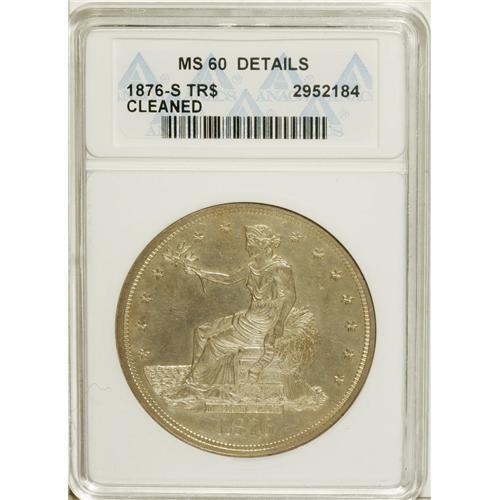 <B>1876-S T$1 --Cleaned--ANACS. MS60 Details.</B></I> NGC Census: (13/365). PCGS Population (29/335). Mintage: 5,227,000. Numismedia Wsl. Price: $392. (#7043)<BR><BR><b>Shipping:</b> Coins & Currency (<a target="_blank" href="http://www.heritageauctions.com/common/shipping.php">view shipping information</a>)