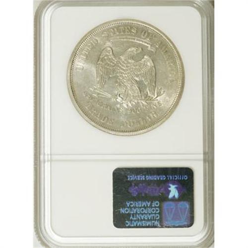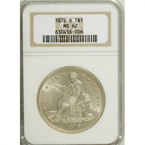 <B>1876-S T$1 MS62 NGC.</B></I> Type One Obverse and Reverse. Bright champagne surfaces exhibit a few grade-defining marks. An attentive strike brings out strong definition on the design elements.<BR><BR><B>Coin Engraver:</B> William Barber<BR><BR><b>Shipping:</b> Coins & Currency (<a target="_blank" href="http://www.heritageauctions.com/common/shipping.php">view shipping information</a>)