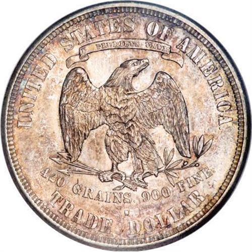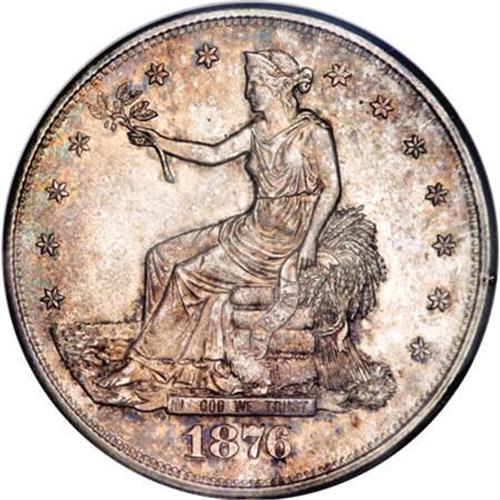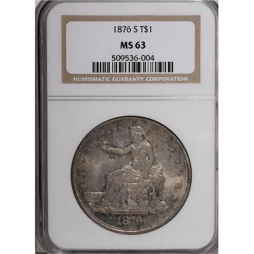 <B>1876-S T$1 MS63 NGC.</B></I> Type One Obverse, Type Two Reverse, Minute S. Splashes of orange and sky-blue patina race across the lustrous surfaces of this Select S-mint Trade dollar. An attentive strike leaves sharp definition on the design features. A few minute marks define the grade.<BR><I>From The Queller Family Collection of Silver Dollars.</B></I><BR><BR><B>Coin Engraver:</B> William Barber<BR><BR><b>Shipping:</b> Coins & Currency (<a target="_blank" href="http://www.heritageauctions.com/common/shipping.php">view shipping information</a>)