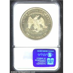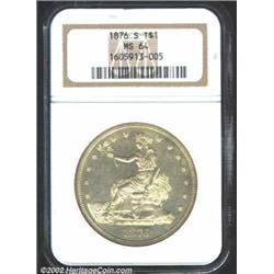 1876-S T$1 MS64 NGC. Type II Obverse / Type II Reverse. Micro S. Breen-5803. This is a prooflike near-Gem whose golden tinged surfaces are pleasingly brilliant in the fields. A generally well struck Trade Dollar, the otherwise sharp definition wanes ever so slightly over a few of the devices at the upper obverse border. Only a few wispy abrasions stand between this well preserved example and an even higher grade. Both Breen and Bowers recognize that this variety is scarce. The latter author makes mention of an MS64 representative in the Santovenia Collection which, apparently, is an significant grade for a survivor of the Breen-5803 variety.From the Andy Geosits Collection of Trade Dollars. Important notice: We expect to be auctioning lots at the rate of 200-250 per hour. Sometimes eBay Premier live bid software cannot keep up with that pace, so we strongly recommend that you place a realistic proxy bid now as insurance to avoid disappointment. Also please note that all Heritage/CAA lots purchased through eBay Premier carry a 20% Buyer's Premium. Please make sure you read the Terms and Conditions.