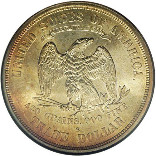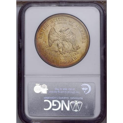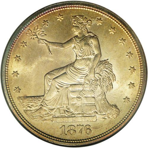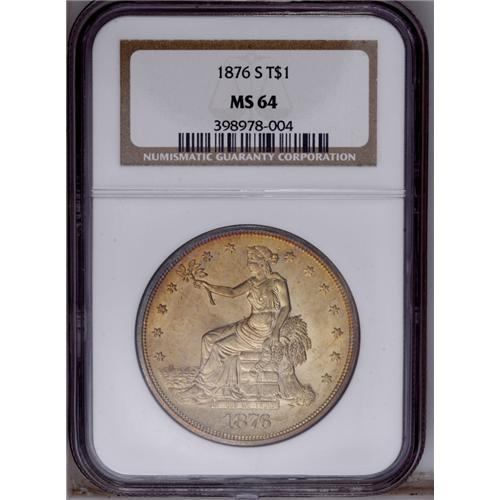 <B>1876-S<T$1> MS64 NGC.</B></I> Type One Obverse and Reverse. Large S. Impressive lemon and cherry-red toning enriches this highly lustrous and refreshingly smooth near-Gem. Portions of the obverse rim are bathed in cobalt-blue. The strike is good, although the occasional mint-made roller mark is faintly visible. This Centennial year type coin would be a worthy addition to a quality silver type set. Census: 72 in 64, 22 finer (1/06).