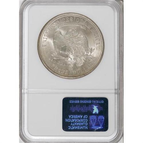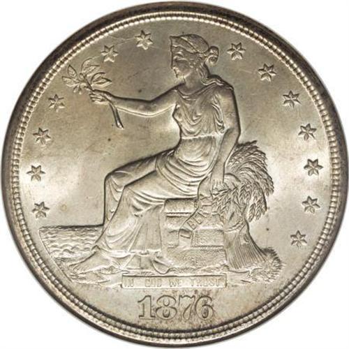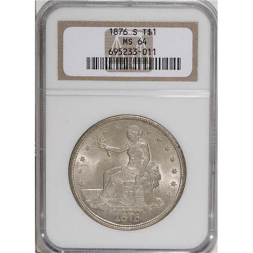 <B>1876-S T$1 MS64 NGC.</B></I> Type One Obverse, Type Two Reverse, Minute S. This near-Gem is lustrous and satiny with both sides showcasing a pleasing Champagne patina. There are no outwardly distracting bagmarks on either side, and the strike is typical for the issue, meaning that there is some weakness on Liberty's head and on the eagle's left (facing) wing.<BR><I>From The Rare Coins of New Hampshire Collector Set.</B></I><BR><BR><B>Coin Engraver:</B> William Barber<BR><BR><b>Shipping:</b> Coins & Currency (<a target="_blank" href="http://www.heritageauctions.com/common/shipping.php">view shipping information</a>)