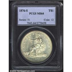 1876-S T$1 MS64 PCGS. Type I Obverse / Type I Reverse. Large S. Breen-5800. Despite large scale exportation to the Orient, the 1876-S was produced in significant enough numbers to ensure its status as one of the most plentiful Trade Dollars in today's market. In grades that approach the Gem BU threshold, however, the '76-S is elusive. A lovely Choice quality survivor, both sides are richly frosted with needle sharp striking detail. There are no outwardly distracting abrasions, and the otherwise pale, golden tinged iridescence yields to swirls of deeper color in a few areas of the reverse field. The hub and mintmark variety represented by the present example is the most plentiful of the '76-S delivery.From the Andy Geosits Collection of Trade Dollars. Important notice: We expect to be auctioning lots at the rate of 200-250 per hour. Sometimes eBay Premier live bid software cannot keep up with that pace, so we strongly recommend that you place a realistic proxy bid now as insurance to avoid disappointment. Also please note that all Heritage/CAA lots purchased through eBay Premier carry a 20% Buyer's Premium. Please make sure you read the Terms and Conditions.