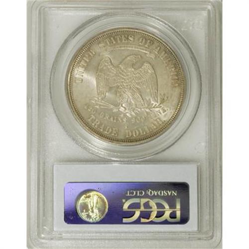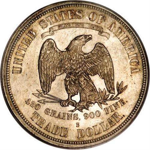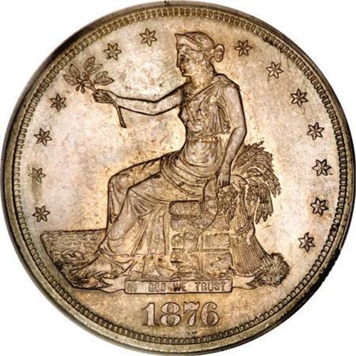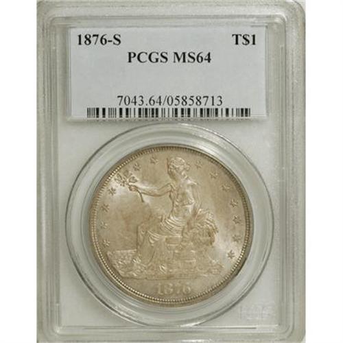 <B>1876-S T$1 MS64 PCGS.</B></I> Type One Obverse and Reverse. Large S. Apricot and lilac toning graces the obverse, while the reverse is cream and sun-gold. The upper obverse has unobtrusive abrasions, but the remainder of this exactingly struck example is well preserved. Population: 91 in 64, 5 finer (3/08).<BR><BR><B>Coin Engraver:</B> William Barber<BR><BR><b>Shipping:</b> Coins & Currency (<a target="_blank" href="http://www.heritageauctions.com/common/shipping.php">view shipping information</a>)