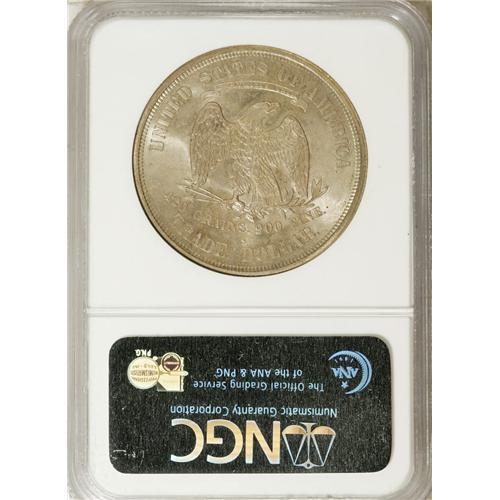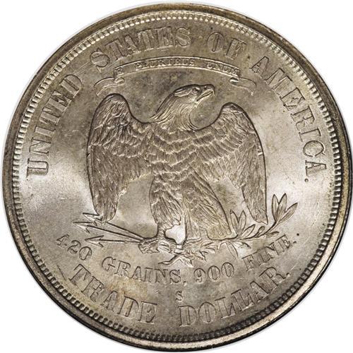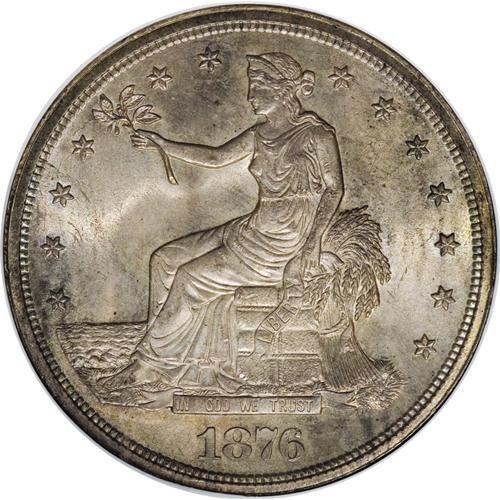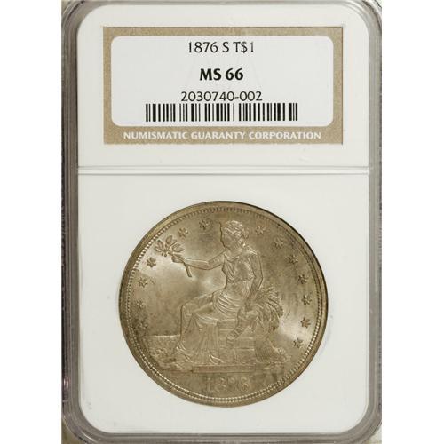 <B>1876-S T$1 MS66 NGC.</B></I> Type One Obverse, Type One Reverse, Large S. The recorded mintage is more than 5.2 million pieces, but this Premium Gem coin is among the four finest graded for the entire issue at NGC and PCGS combined. NGC has certified three pieces as MS66, while PCGS has graded but a single MS66. This delightful piece offers radiant cartwheel luster over lightly patinated dove-gray surfaces, with considerable field-device contrast and glints of amber-gold and fuchsia in the protected areas. The strike is needle-sharp, and thorough perusal with a loupe fails to locate any significant distractions. Type collectors, take note of this unimprovable coin!<BR><BR><b>Shipping:</b> Coins & Currency (<a target="_blank" href="http://www.heritageauctions.com/common/shipping.php">view shipping information</a>)