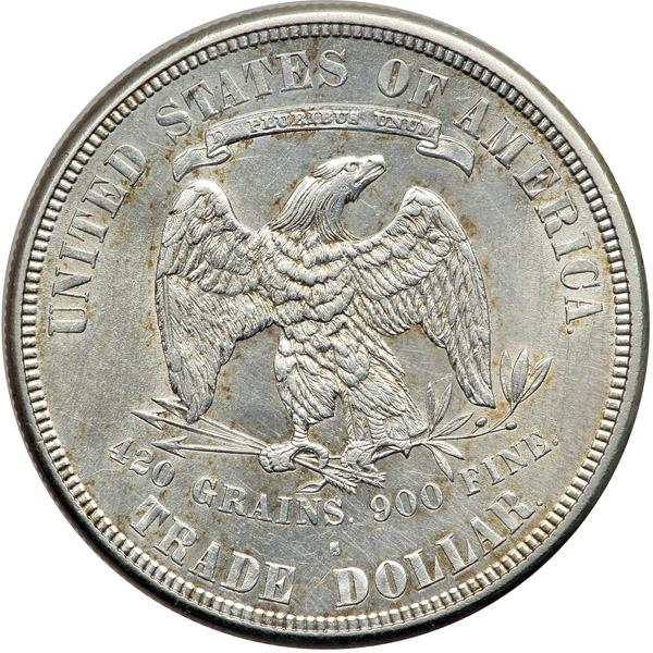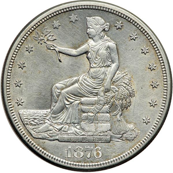 1876-S Trade Dollar. AU-55. Moderate hairlines on both sides.
