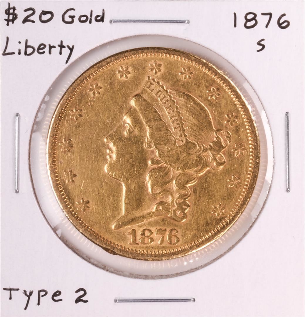 One 1876-S Type 2 $20 Liberty Head Double Eagle Gold Coin.