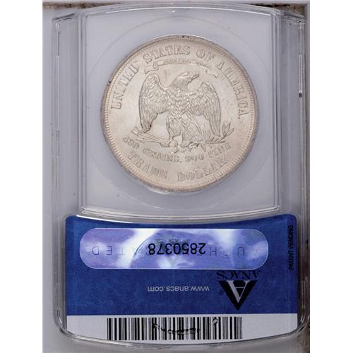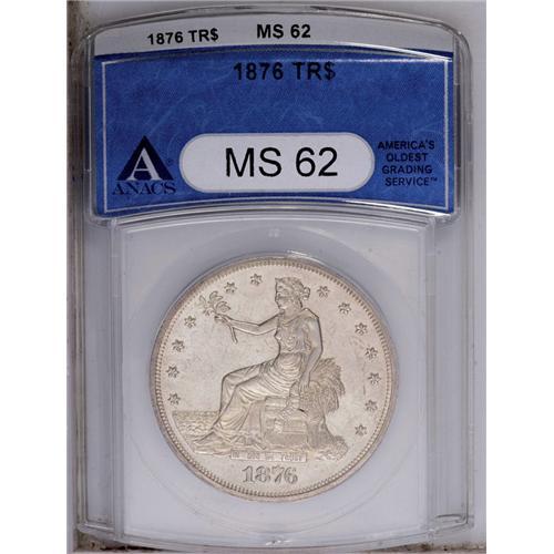 <B>1876<T$1> MS62 ANACS.</B></I> Type One Obverse and Reverse. This nearly untoned scarcer date Trade dollar has a lustrous reverse and a subdued obverse. UNITED STATES OF AMERICA has numerous defective serifs, as produced from a lapped reverse die.